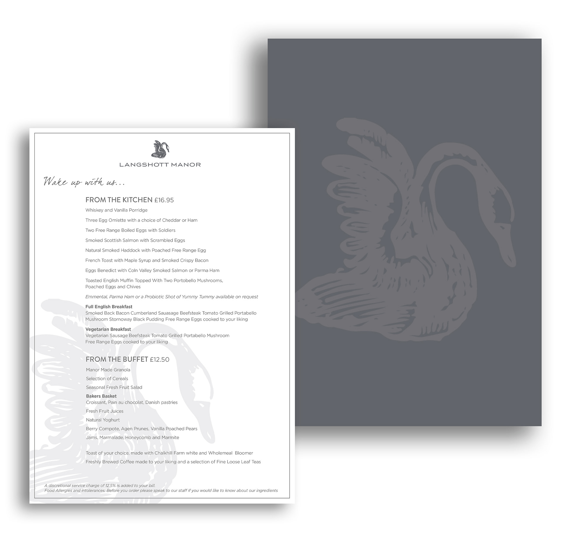 BELOW: Langshott Manor needed a consistent and luxury looking set of menus to cover their high end evening menu, breakfast, afternoon tea and lunch. With regular updates the menus needed to be overprinted in house. I created a simple, but clean template to be used with a watermark of the identity on the menu face and the reverse a pre printed silver watermark of the identity. The logo on the front of the menus was silver foiled to give that luxury edge.