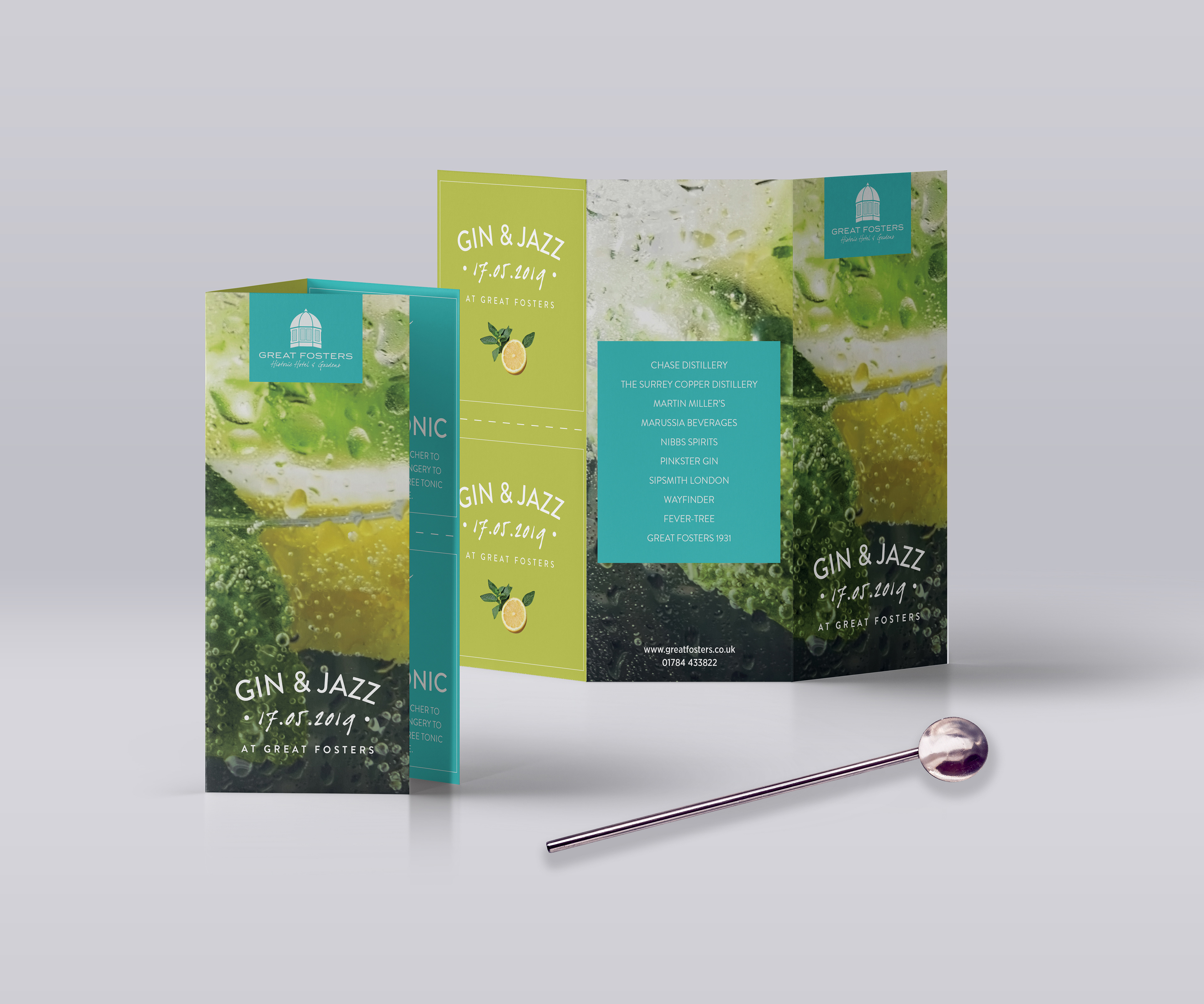 BELOW: This was an event piece of collateral for a Gin and Jazz evening at Alexander House. The folded DL card features perforated vouchers and a branded silver cocktail stirrer giveaway, attached to the card.