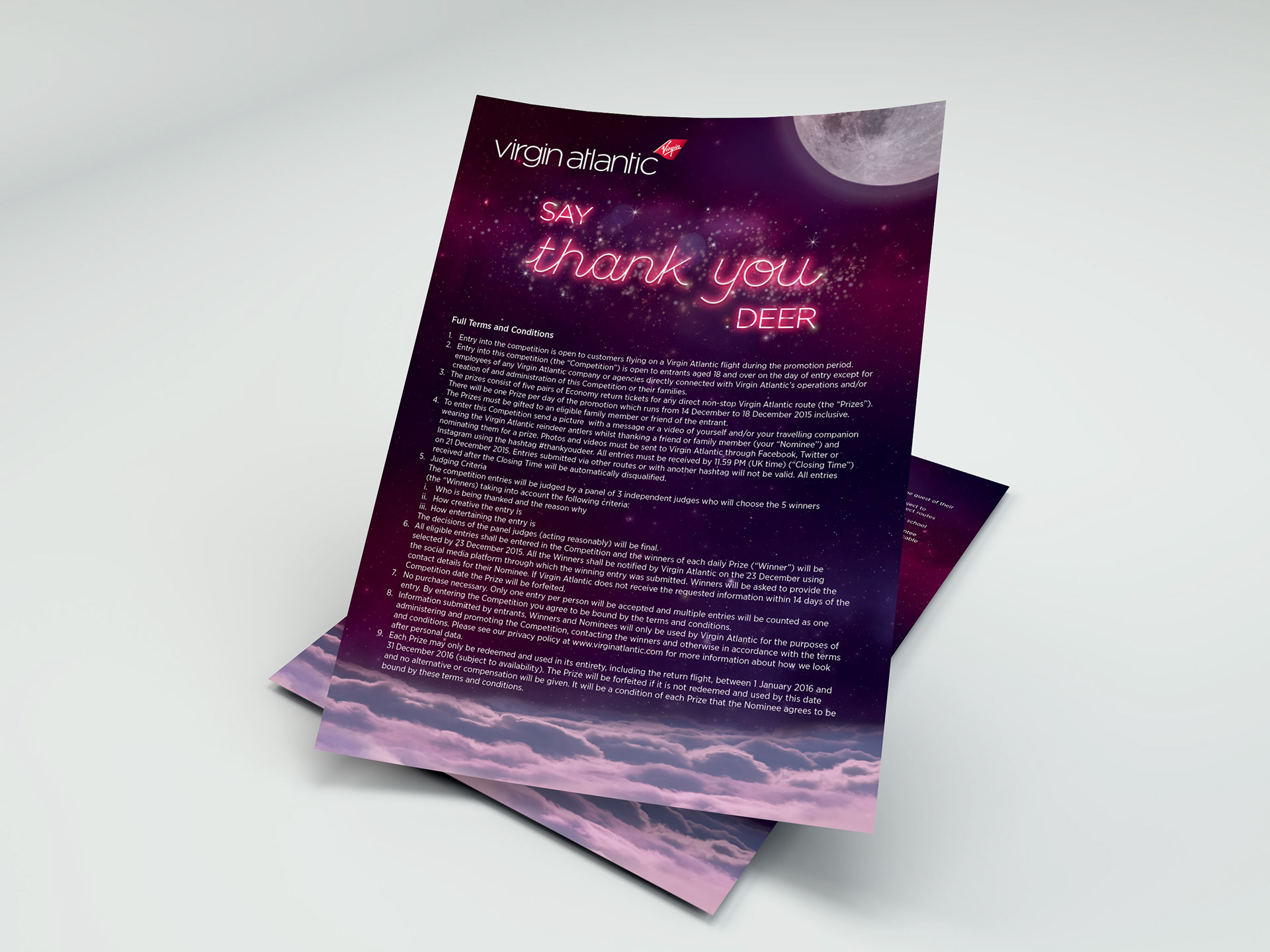 As design lead for Virgin Atlantic's Christmas activity at the airports, I collaborated with Microsoft to deliver a seamless and consistent experience for customers globally, on the ground and in the air. We created a gaming experience across two aircraft from either side of the world. I designed and crafted the creative ideas and the look and feel to support the game and designed and produced a variety of assets for the ground and air experiences. This was the first year that the activity became global for the airline and encouraged passengers to put on their antlers and #ThankYouDeer to win flights to gift to someone special.