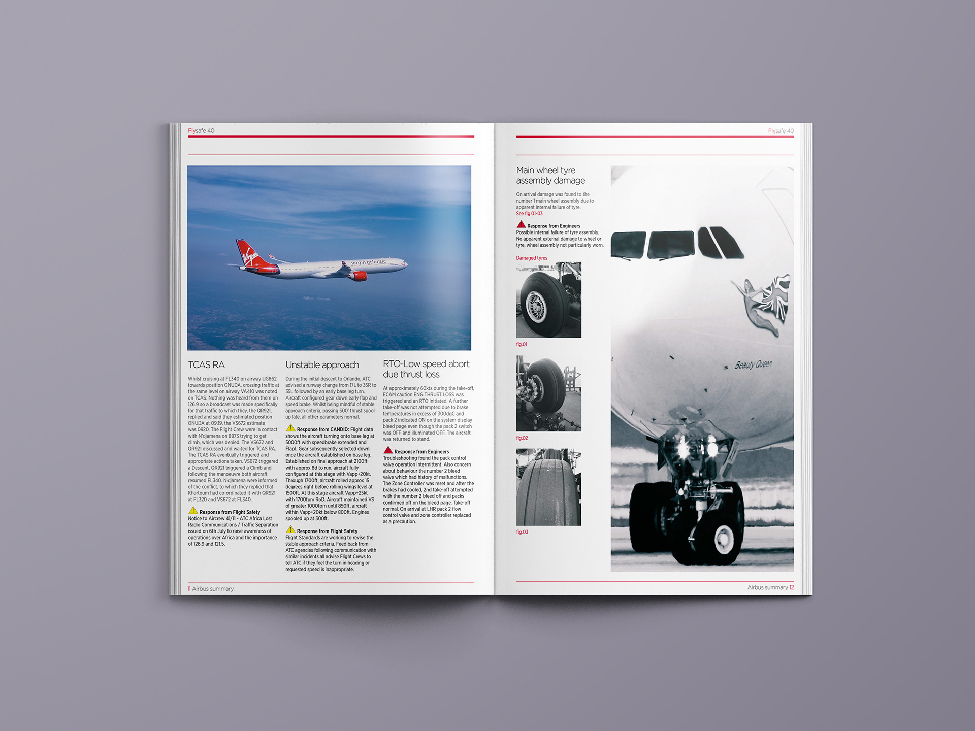 Flysafe is a legally required document, produced quarterly for all members of Safety and Security in the airline industry. It documents air traffic incidents across all airlines and the consequences and learnings, with the intention to avoid future problems and improve flight safety. It is an internal document and as the lead designer on this project I wanted the magazine to have a documentary approach to the styling, previously it was populated with poor imagery and produced in Microsoft Word. With each cover representing a particular seasonal sky, the magazines would create a collectible set. After designing and producing the first in the series I was then able to steer other members of the Brand team on the next issues.