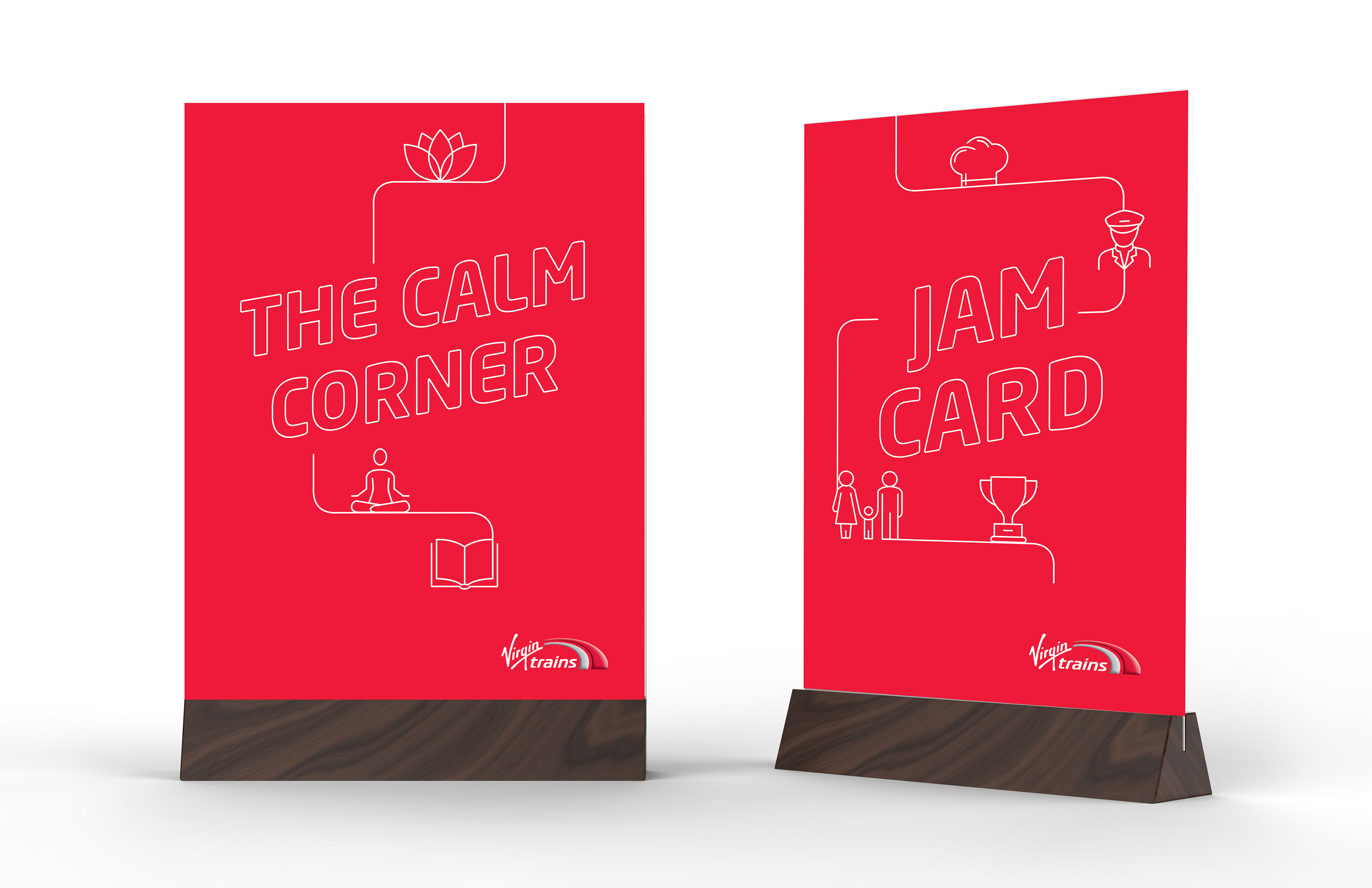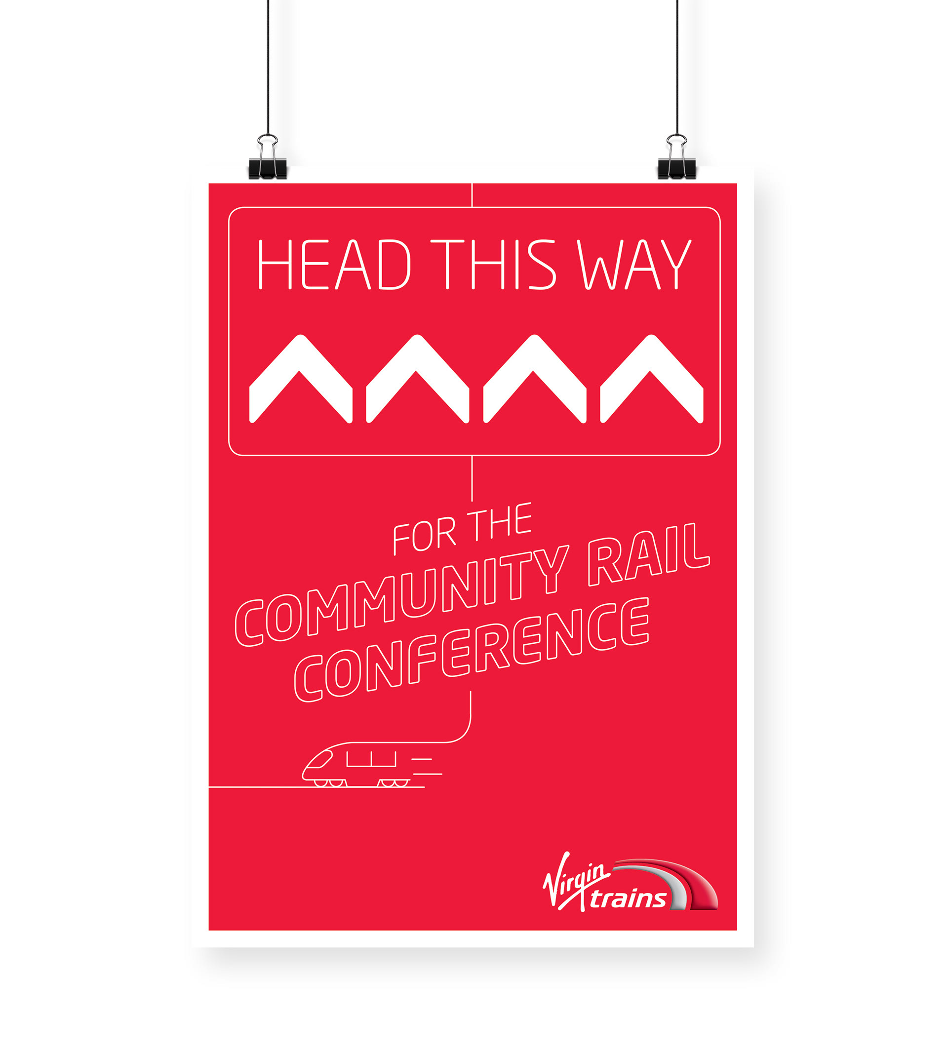 Virgin Trains were holding a community rail conference in London in a clinical, white environment. It was a prime opportunity to paint the venue red. All collateral was the signature Virgin Trains red as a base so it would provide vibrant beacons in the space for easy navigation and brand awareness. The linear illustration theme gave the sense of a journey across all the assets.